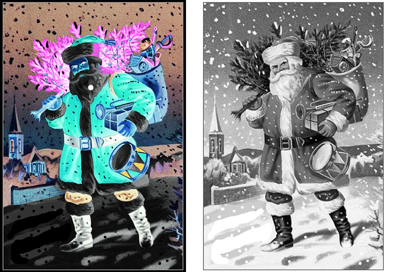 Stare at the white spot on Santa's beard on the left image for 15 seconds, |